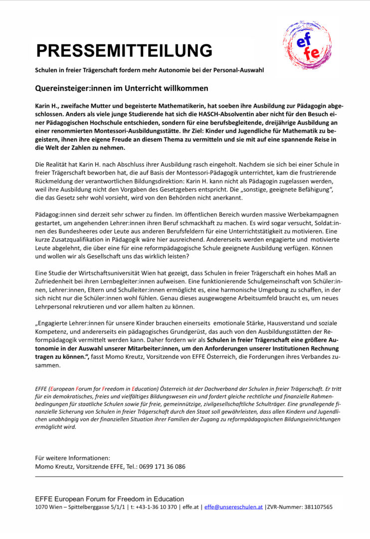 Aktuelle Presseaussendung: Schulen in freier Trägerschaft fordern mehr Autonomie bei der Personal-Auswahl!